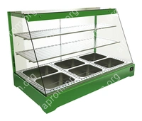 Тепловая витрина Кобор CR2-117H серии Standart предназначена для демонстрации, подогрева и поддержания в теплом состоянии различных блюд на предприятиях общественного питания и торговли. Модель оснащена перфорированными полками 1120х350 и 1120х280 мм и подсветкой.